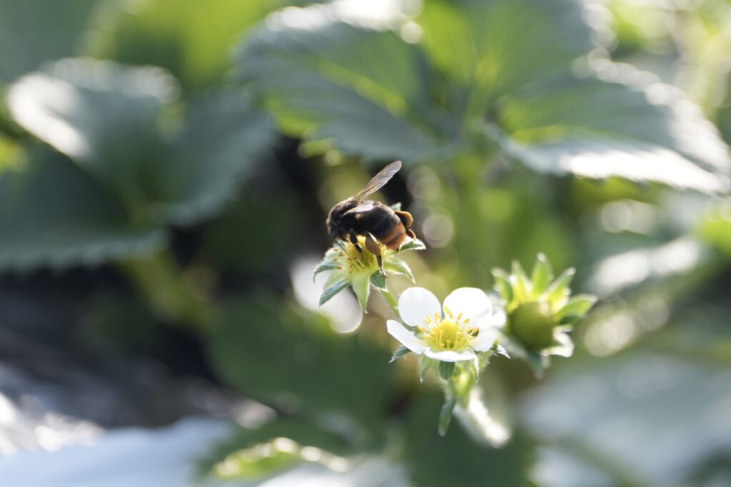 いちご栽培ハウスの中にはたくさんの蜂が飛んでおります。